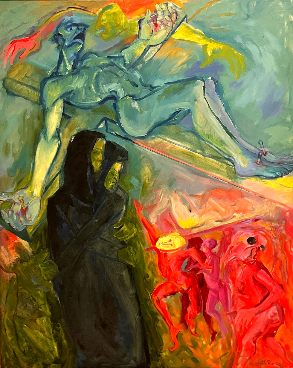 Though almost impossible to choose a favourite, ‘Masquerading’ might be it for me. It’s dynamic, bright, intriguing, a tad ominous. It walks the line between abstract, figurative and surrealist. The quality of the paint is potent, yet the legible brush-marks suggest a tender humanity within. Bright, primary colours pair with subtle purples in an other-worldly palette. Whilst the figures try to leap off the canvas, they also ground this surreal piece in reality.